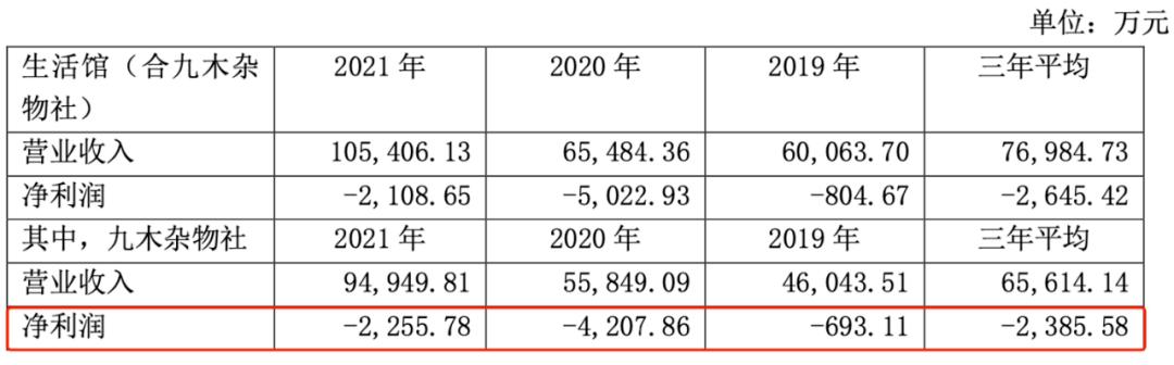 财报显示,2019-2021年,九木杂物社净亏损分别为693.11万元、4207.86万元、以及2255.78万元。