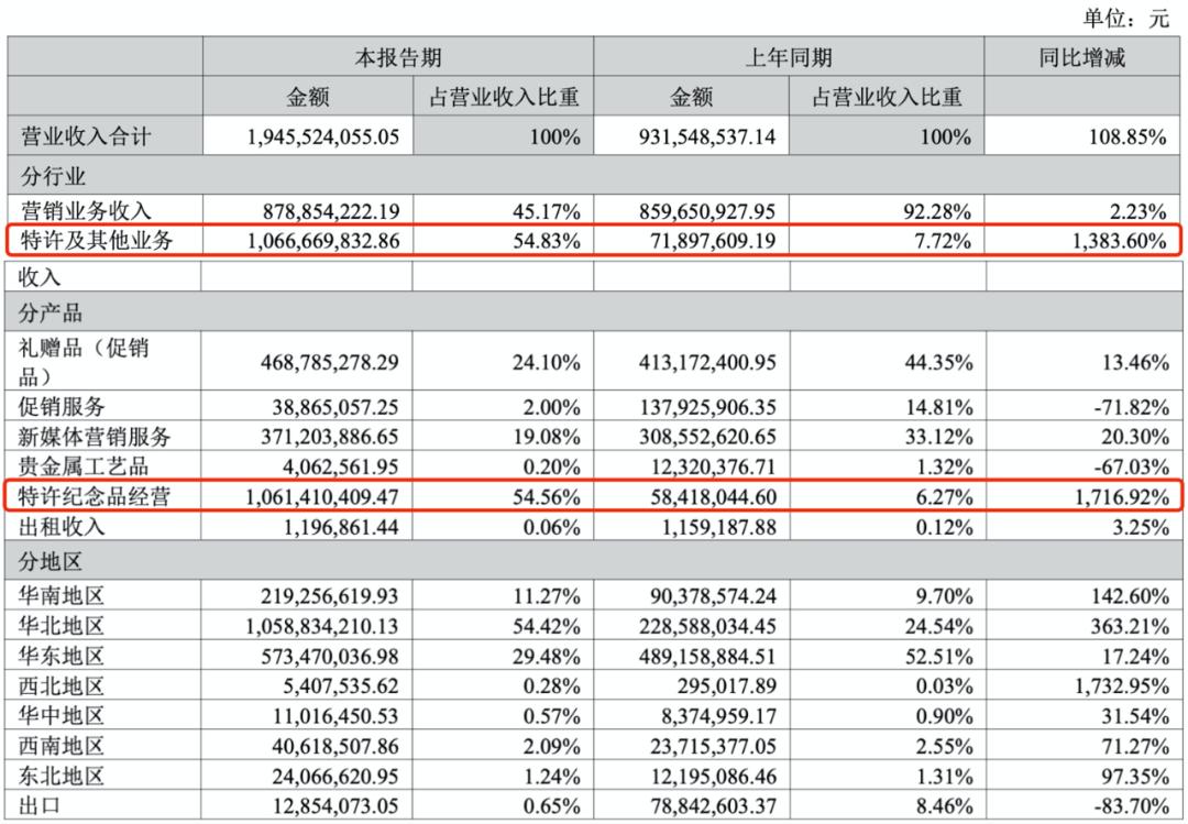上半年,冬奥特许纪念品为其带来10.61亿元的营收,同比增长1716.92%,占总营收的54.56%。