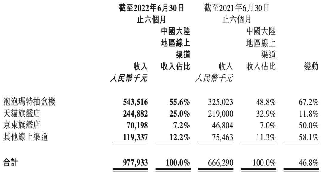 中国大陆地区的“线上渠道收入”同比增长46.8%至9.78亿元,其中泡泡玛特抽盒机收入5.44亿元,天猫旗舰店收入2.45亿元,京东旗舰店收入7019万元,其他线上渠道收入1.19亿元。
