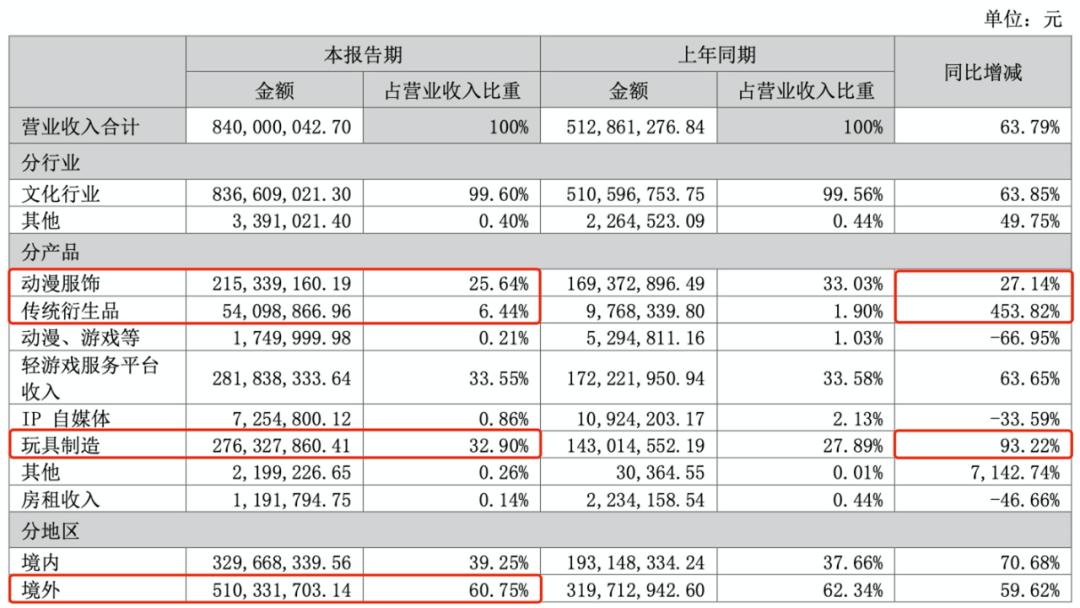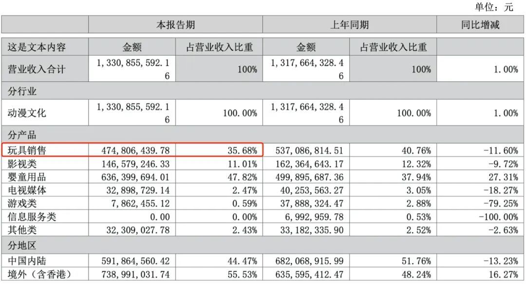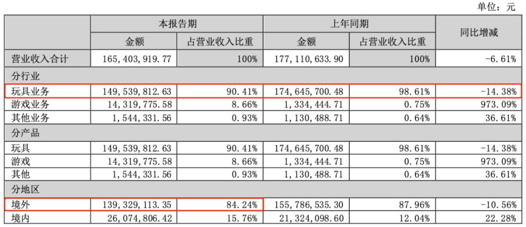 从营收构成来看,报告期内,“玩具业务”上半年贡献约1.50亿元营收,同比下降14.38%;分地区来看,“境外营收”在总营收中占比84.24%,境外占比15.76%,上半年,境外收入占比和营收均有所下滑。