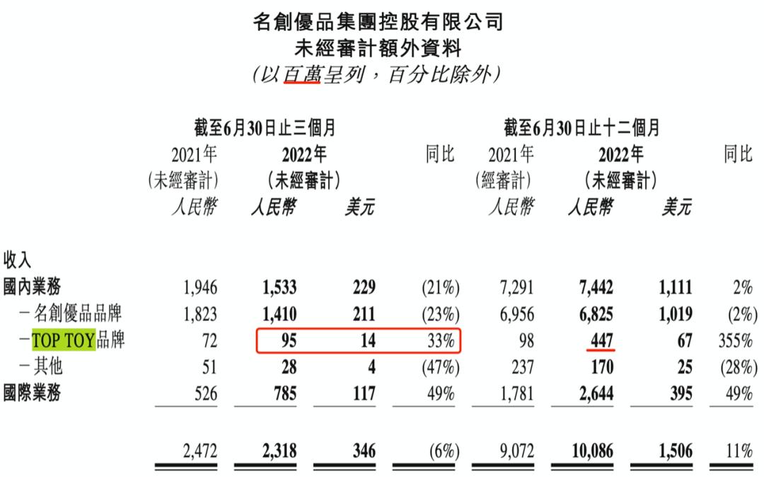 名创优品最新财报数据显示,今年二季度,TOP TOY实现收入9500万元,同比增长33%;第一季度,收入为1.11亿元,同比增长377%。因此,2022上半年,TOP TOY营收约为2.06亿元。财报指出,奥密克戎的区域性使得前往名创优品及TOP TOY门店所在商场的客流量有所减少,亦导致若干门店暂停营业。