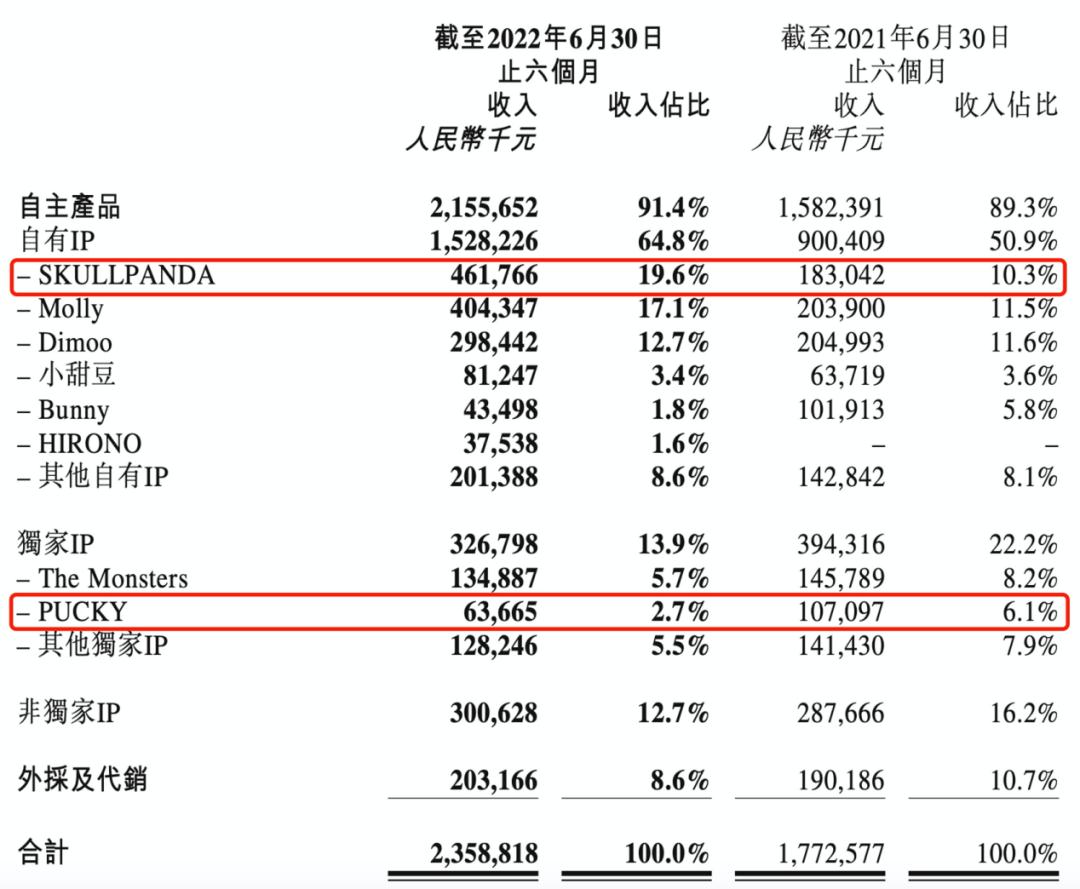 按IP进行划分,2022年上半年,自有IP及所有IP中,SKULLPANDA贡献最多收入,达4.62亿元,占总收入的19.6%,Molly和Dimoo分别占比17.1%和12.7%,贡献收入4.04亿元和2.98亿元。