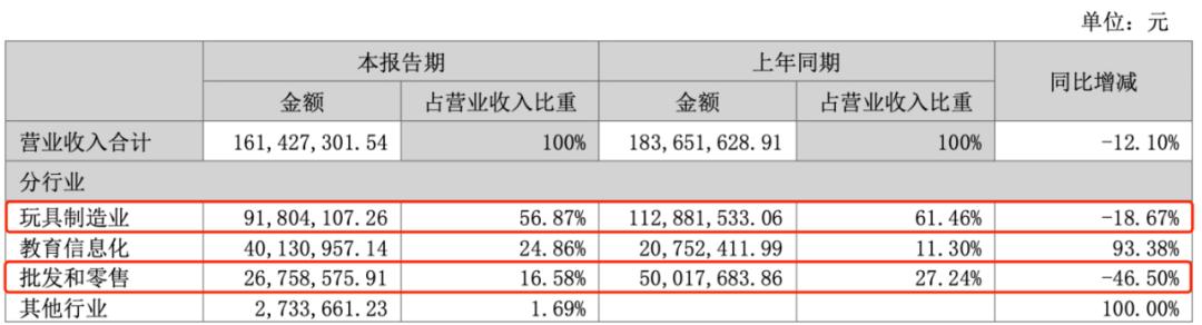 报告期内,“玩具及相关业务营业收入”为1.19亿元(玩具制造业收入9180.41万元,同比减少18.67%;批发和零售收入2675.86万元,同比减少46.50%),同比下降27.22%,在公司营业总收入中占比73.45%。