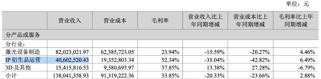 今年上半年,金运激光的IP衍生品运营业务(IP小站)实现收入4060.25万元,同比减少35.04%。