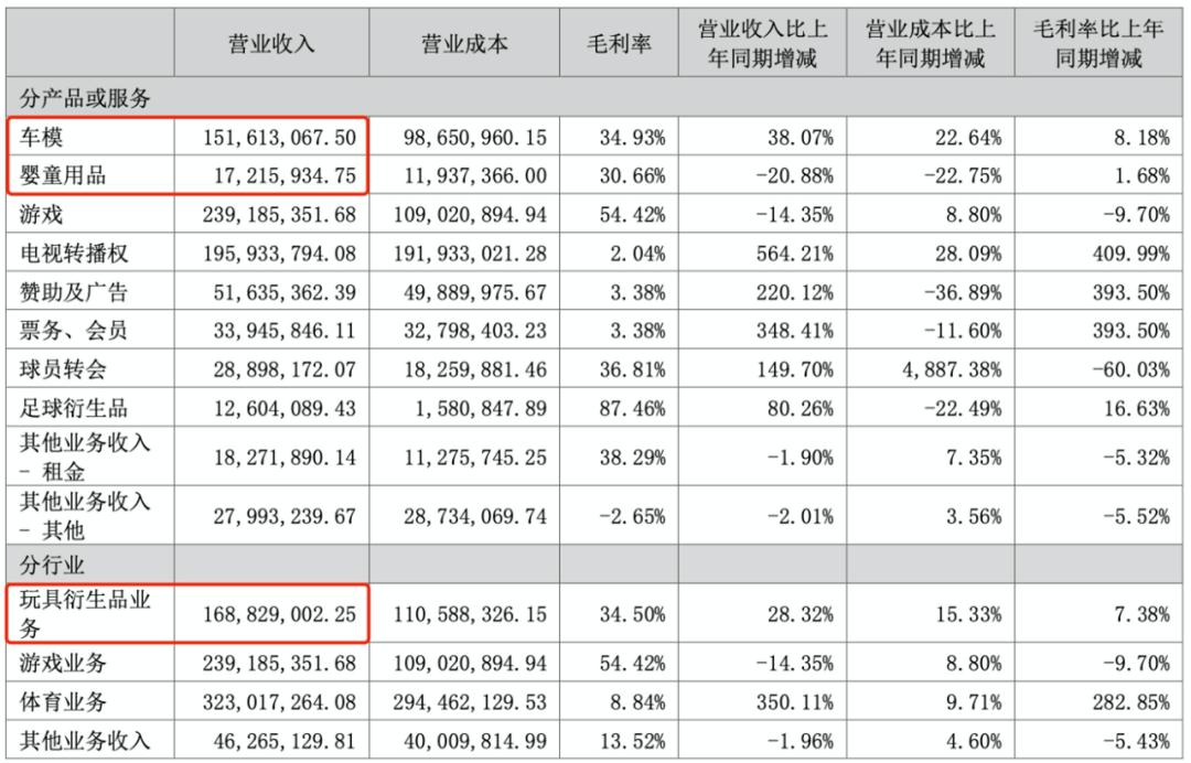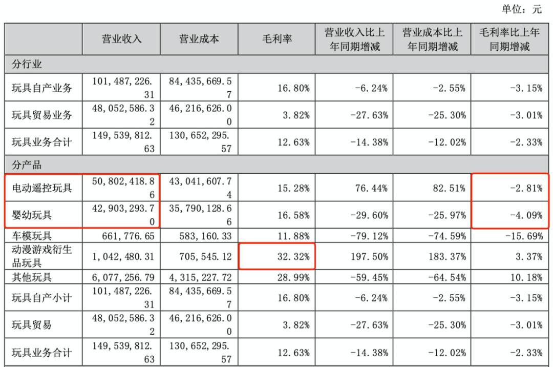 分产品来看,玩具自产业务中,“电动遥控玩具”营收贡献最高,达5080.24万元,“婴幼玩具”收入位列第二,为4290.33万元;毛利率最高的为“动漫游戏衍生品玩具”,达32.32%,同比上升3.37%。