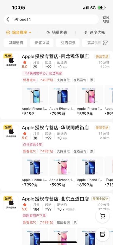 美团外卖搜索“iPhone14”可进入附近Apple 授权专营店