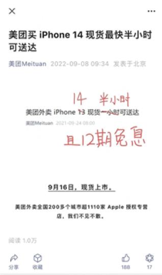 美团外卖与1000余家Apple 授权店合作 iPhone 14最快半小时送达