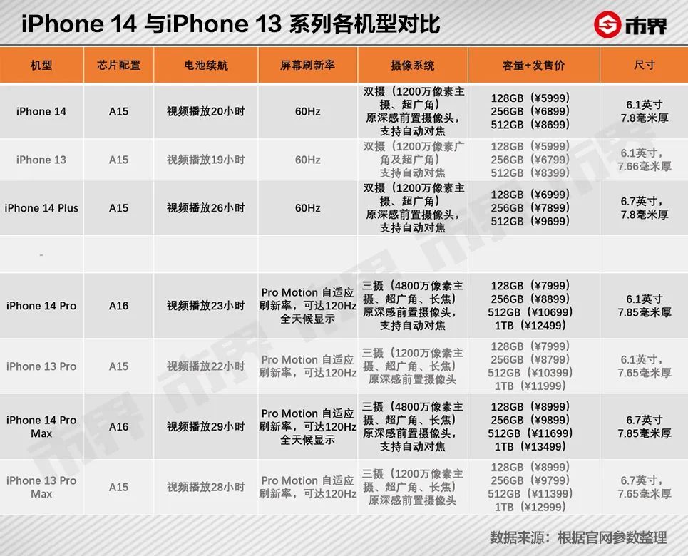 只有iPhone 14较iPhone 13轻了1克、厚了0.15毫米,且能够多播一小时的视频,算是“礼貌”地进步了一点点。