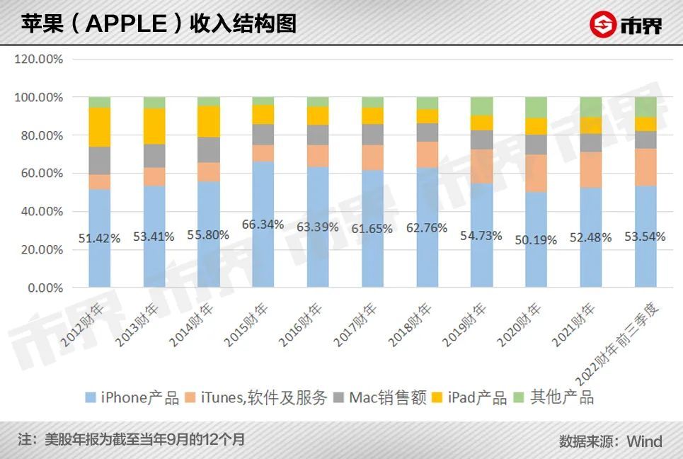 在这过程中,苹果手机贡献的收入占比虽然有所波动,但始终在50%以上,2021财年以来还有连续的提升。