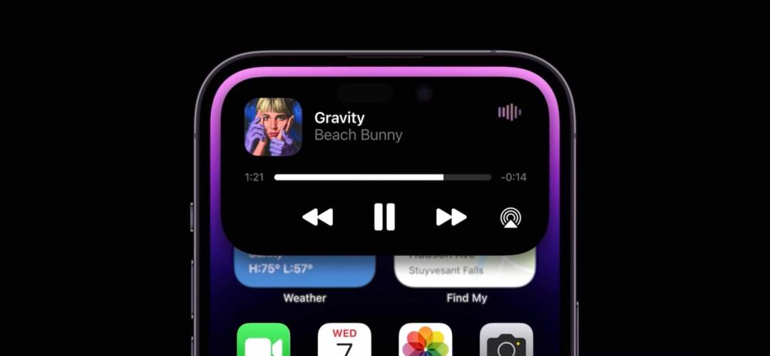 更值得一提的是药丸挖孔区域的UI设计,让这颗“药丸”不再是一般的“药丸”,而是一颗“灵动的药丸”——不仅会时而长时而短,黑底区域还会在使用不同应用软件时呈现不同的画面,比如播放音乐时出现音轨,拨打电话时显示通话时长,导航时则提示转向。