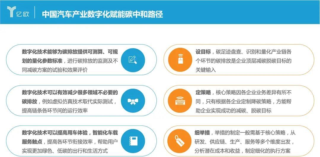 短期看,中国车企推进碳中和的主要方式为建立绿色工厂以及购买碳信用额,与汽车产业数字化的联系较浅;但从中长期看,中国车企推进碳中和的方式主要包括发展新能源车型、提升智能制造水平、加强供应链管理,其无一不与汽车产业数字化息息相关。综合来看,亿欧智库认为碳中和是拉动汽车产业数字化进阶发展的新引擎。