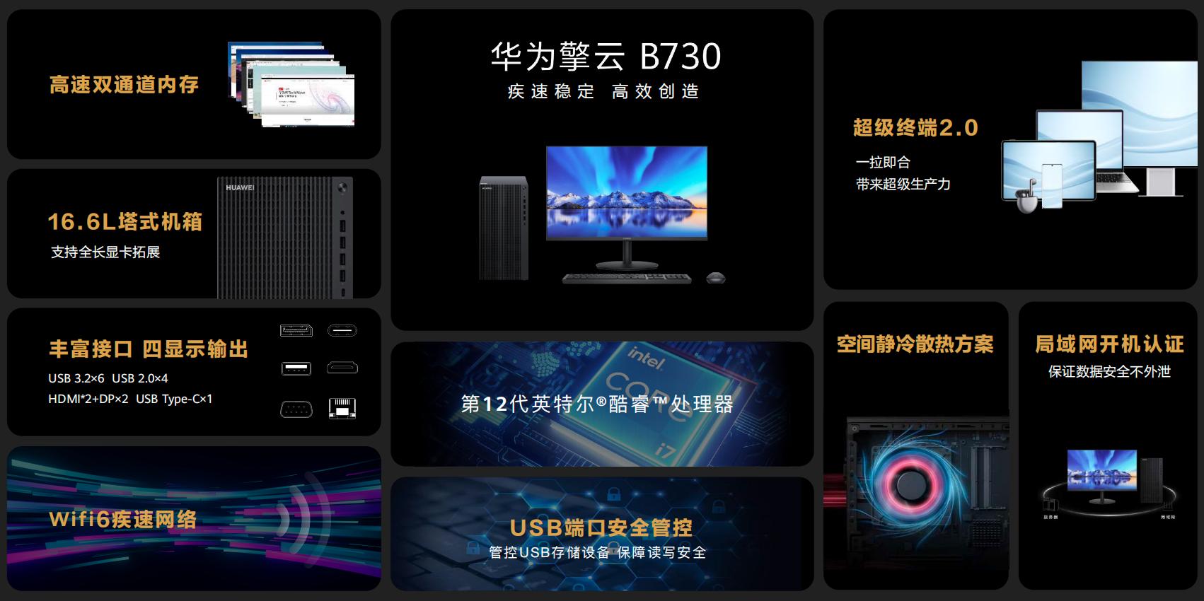 对于商用客户来说,性能、安全、保障是他们选购产品的关键词,而华为擎云 B730正是从基于这些需求打造的全新商用台式机。在政府及大中小企业加速数字化转型的当下,华为擎云 B730将凭借强大的品质、智慧以及可靠的服务,助力政府及大中小企业客户的生产力提升,为其腾飞带来更多可能。