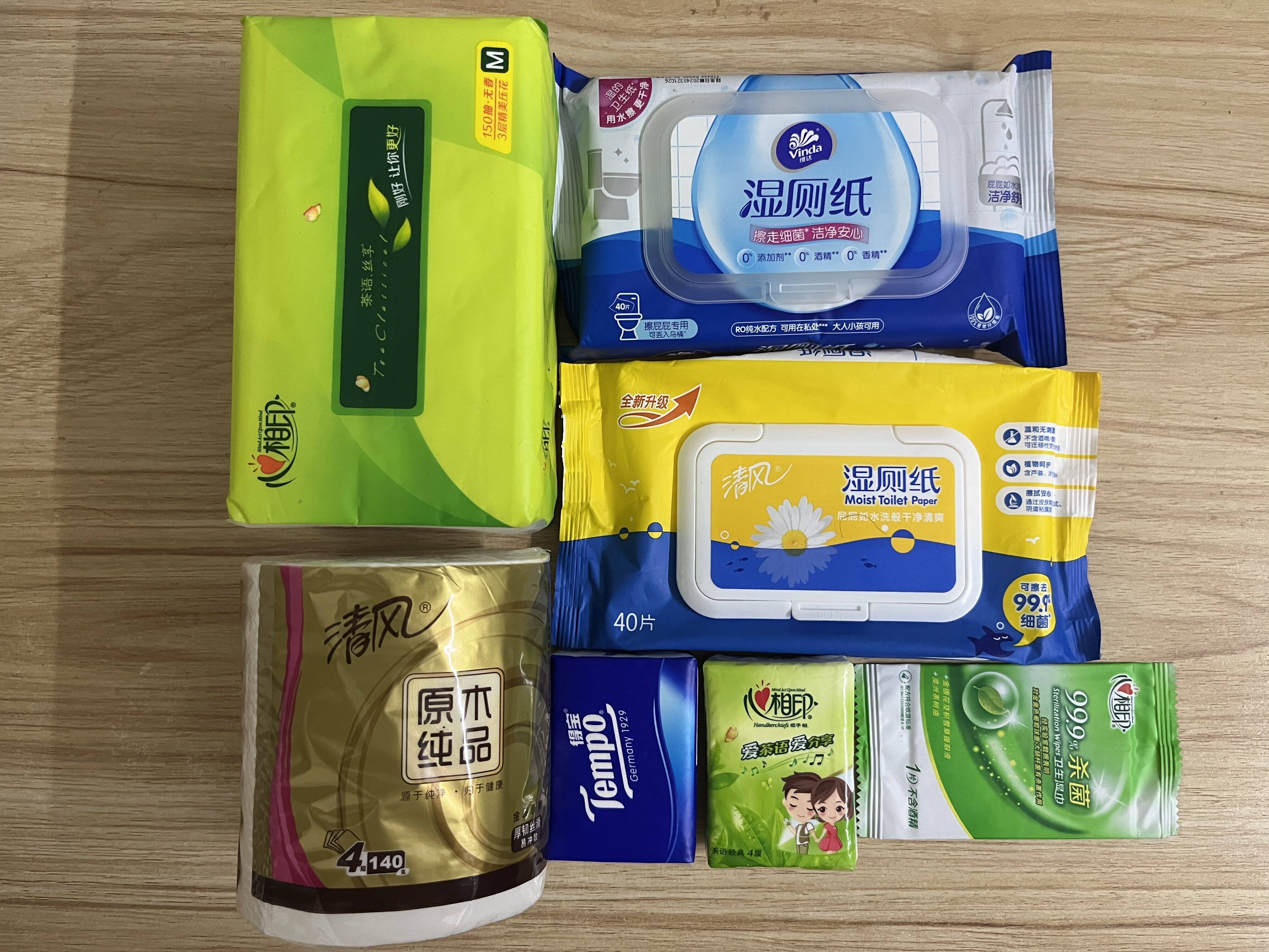 我的生活用纸,包括卷纸、抽纸、手帕纸、湿厕纸和湿巾。