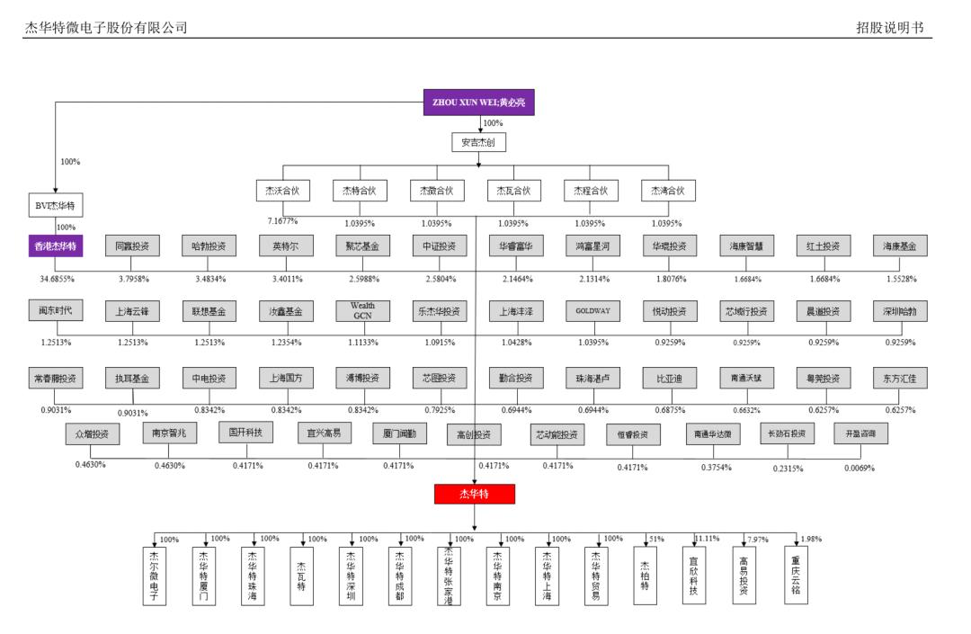 值得注意的是,从资本结构上看,杰华特属于港资控股企业,香港杰华特持股比例为34.69%,实控人为杰华特创始人ZHOUXUNWEI和黄必亮。