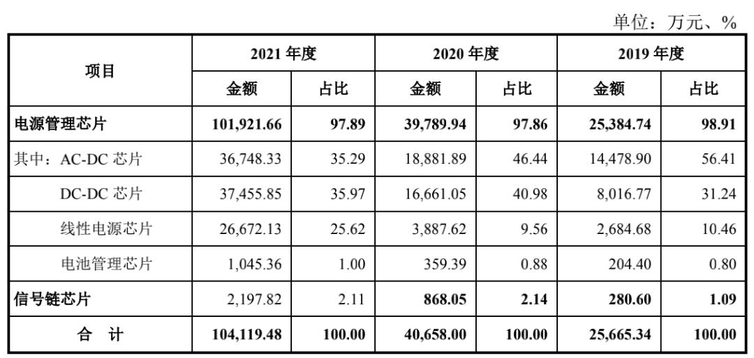 招股书显示,杰华特营收97%以上的部分均是来源于电源管理芯片,涵盖AC-DC芯片、DC-DC芯片、线性电源芯片、电池管理芯片。其余2%左右的营收来源于信号链芯片。