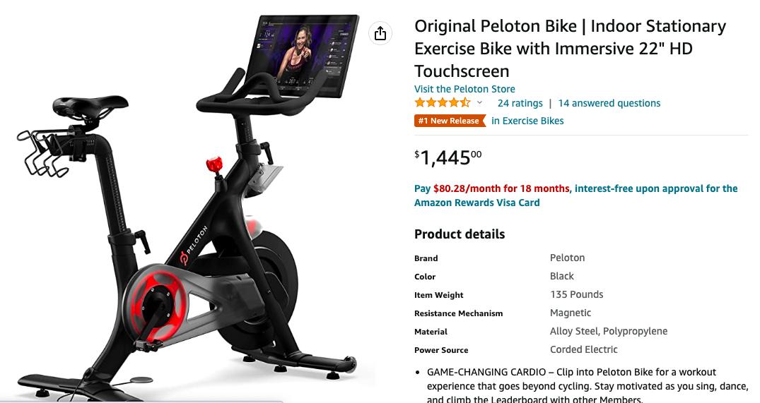 根据双方合作协议,Peloton将在亚马逊美国网站上销售其部分联网健身设备和配件,包括一代Bike单车,零售价1445美元;以及力量训练产品Peloton Guide,售价295美元;但不包括相对昂贵的Bike+和Tread跑步机。