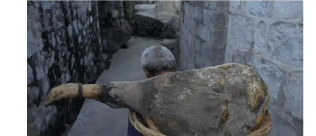 这个村前几年刚脱贫,收入主要靠做火腿。每年到9月,老人们就会背着火腿下山,在集市卖了,供孩子上学。