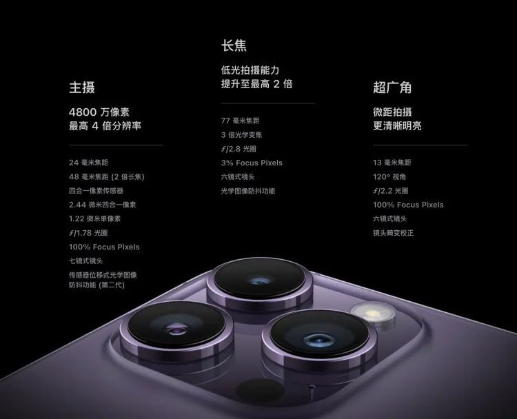 在影像上,iPhone 14 Pro/Max将主摄升级为了4800万像素四合一主摄,24毫米焦距,ƒ/1.78光圈,7P镜头,并且加入了第二代位移传感器光学防抖技术。