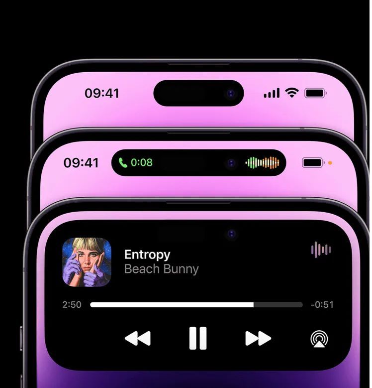 更重要的是新增了一个叫“灵动岛”的功能,在这个“药丸屏”中实现了硬件与软件的协同。灵动岛功能会以醒目的方式弹出音乐、赛事比分、FaceTime 通话等各种消息,让用户不必放下手头的事情,就能在手机顶部轻松地与 iPhone 交互。