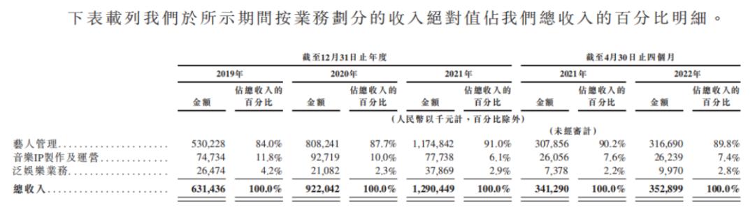 数据显示,公司高度依赖艺人管理业务,2019年~2021年,公司艺人管理营收占总收入比例逐年上涨,分别为84%、87.7%及91%。2022年前四月,公司排名第一的艺人营收贡献比例更是高达56.8%,一人撑起公司收入“半边天”。