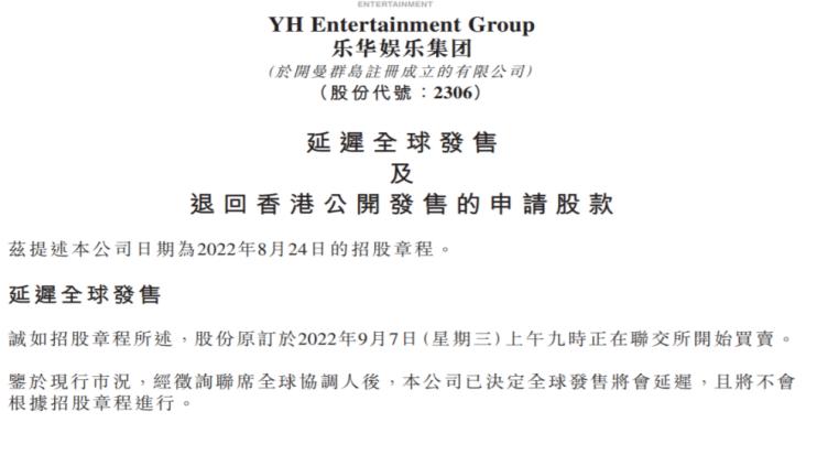 9月2日晚间,乐华娱乐发布公告称,“鉴于现行市况,经征询联席全球协调人后,本公司已决定全球发售将会延迟,且将不会根据招股章程进行。”而在此之前,乐华娱乐拟全球发售约1.33亿股股份,发售价拟为每股发售股份6.8港元~8.5港元。