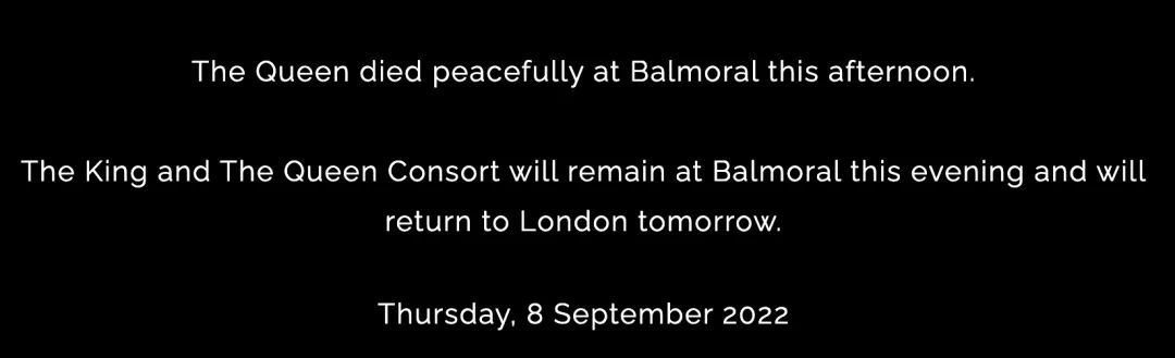 白金汉宫在声明中写道:“女王今天在巴尔莫勒尔安详地去世了。”