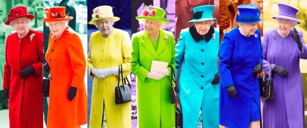 不过在着装上,女王并不喜欢一成不变的黑色,反而喜欢彩色系衣服,一个标准的“英国女王style”通常包括:一件彩色大衣,一顶和大衣同色的帽子、珍珠项链、宝石胸针、一只Launer London手提袋和一双黑色粗跟皮鞋。因为穿衣色彩的丰富多彩,伊丽莎白二世被称为“彩虹女王”(Rainbow Queen)。
