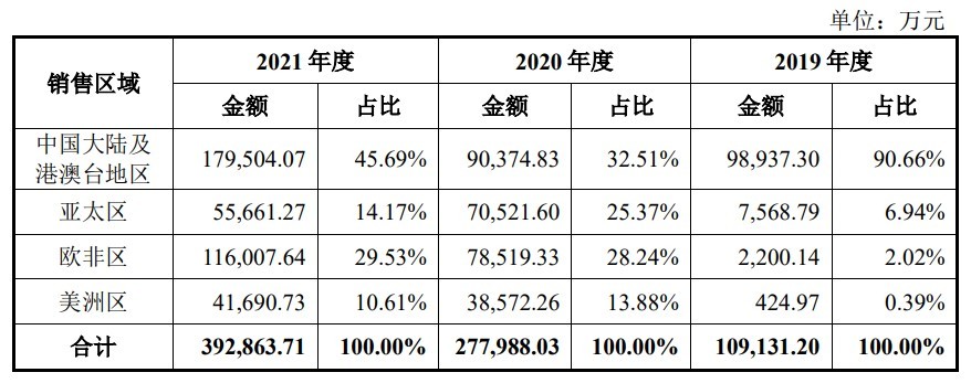 2019年-2021年各期,公司积极拓展海外市场,初步建立了全球化营销体系,产品逐渐获得境外客户认可。招股书显示,华大智造来自中国大陆及港澳台以外地区的收入占比分别为9.34%、67.49%和54.31%,收入占比大幅增长,呈逐年增长趋势,尤其2020年取得明显放量。