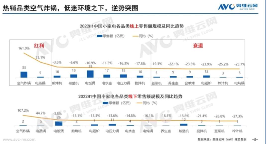 据奥维云网数据显示,2022年上半年,电磁炉、榨汁机、豆浆机、破壁机等品类线上零售额持续下降。为数不多保持逆势走高的品类是空气炸锅和电蒸锅。