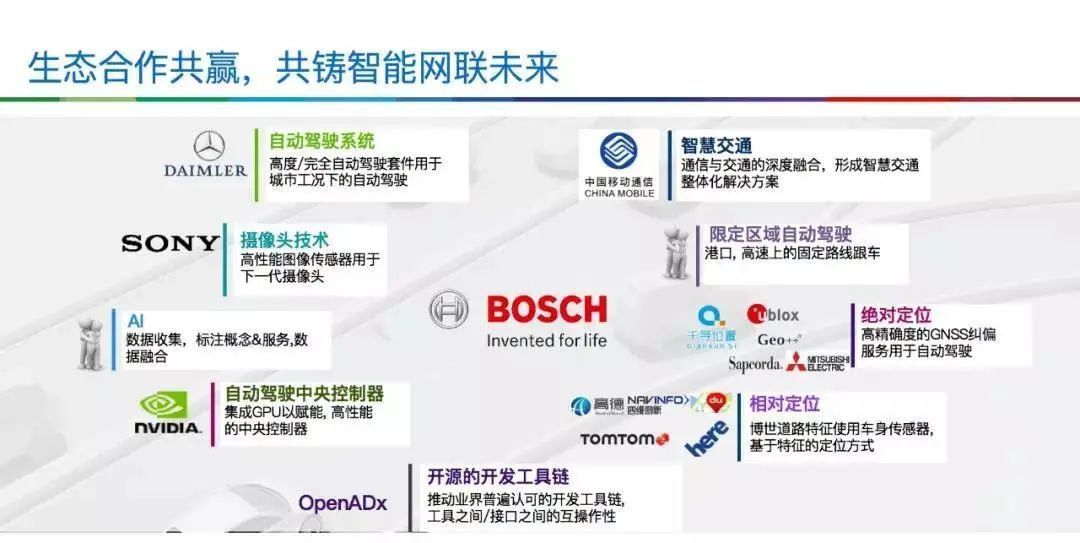 除了自身策略转变以及商业模式的多元化探索外,博世在投资市场也在积极布局,与产业链企业进行深度合作和配合,比如跟戴姆勒传统主机厂在自动驾驶方面进行全方面合作;跟中国移动在V2X方面有一些合作;跟索尼在摄像头技术方面进行合作;和英伟达在芯片、软件方面有合作;和国内多家地图商在高精地图和定位方面有合作。