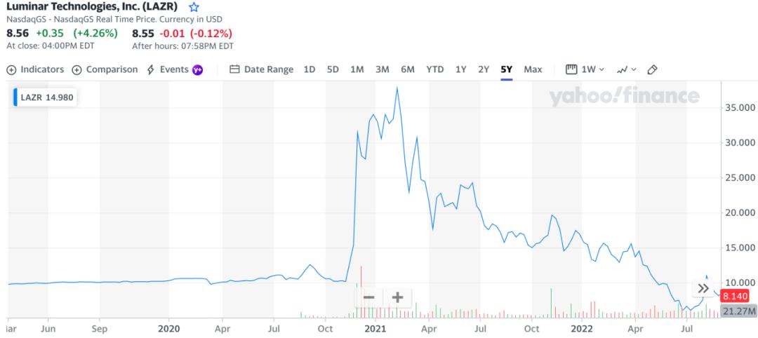 2020年12月,美国初创企业Luminar Technologies通过与特殊目的收购公司Gores Metropoulos 的合并使公司上市。Luminar的股价从37美元跌到现在的8美元。2021年,该公司的收入为3194万美元,全年非GAAP净亏损为1.332亿美元。Luminar 的虹膜传感器正处于C-sample阶段,准备并自动化其汽车级制造能力,预计2022年底前实现批量生产准备。该公司预计2022年前瞻订单至少同比增长40%。