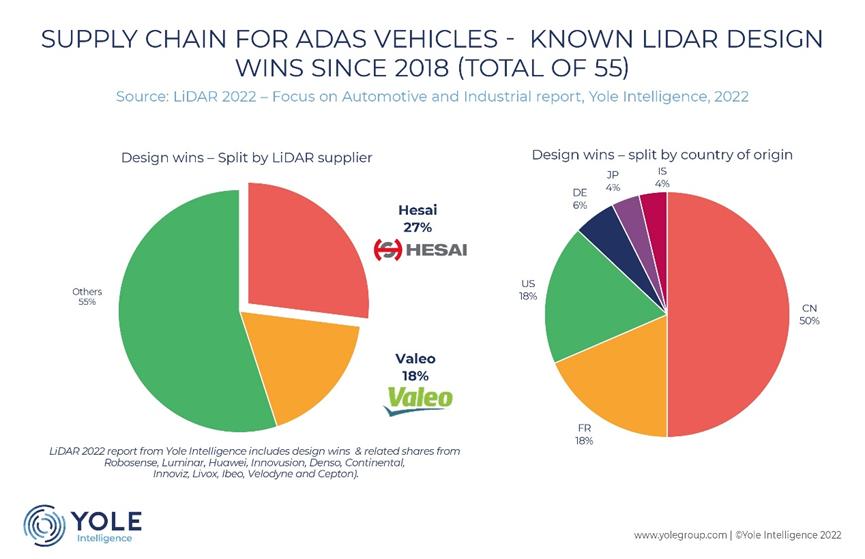 国内虽还未有上市的激光雷达企业,但在激光雷达这个领域,中国厂商却占有重要一席。据Yole的报告指出,目前,中国激光雷达供应商已占全球ADAS市场的50%。禾赛、速腾聚创、华为和览沃是激光雷达领域的重要玩家。在激光雷达制造商中,禾赛在ADAS 设计胜率、L4 级自动驾驶激光雷达市场份额和汽车激光雷达总收入方面排名第一。目前已有多款国内的车型搭载了禾赛AT128固态激光雷达。