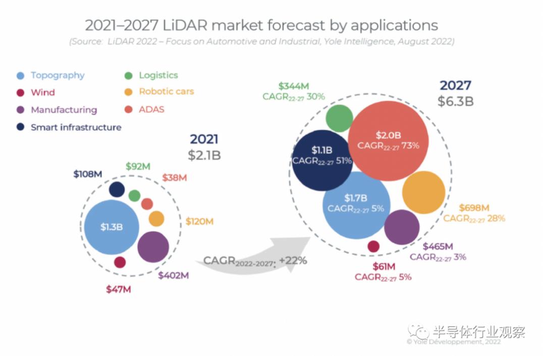 Yole的报告指出,用于汽车和工业应用的激光雷达市场预计将从2021年的21亿美元增至2027年的63亿美元,2022年至2027年间的复合年增长率 (CAGR)为 22%。汽车应用将是这一增长的主要驱动力,预计2027年汽车激光雷达市场将从2021年的3800万美元增至20亿美元。