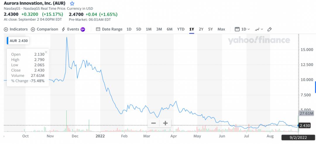 Aurora Innovation由Chris Urmson、Sterling Anderson和Drew Bagnell于2017年创立。曾几何时,Aurora是自动驾驶技术领域最有前途的公司之一,其推出的Aurora Driver解决方案中含有自研的FirstLight激光雷达、规划安全路径的软件,以及为它们提供动力并将它们与车辆集成的计算机组成。现在,它的股价已经从最高的12美元跌到2美元。据彭博社报道,首席执行官Chris Urmson的一份公司备忘录列出了Aurora可能被苹果和微软收购的潜在情景。2021年,该公司的收入为8253万美元,年度运营亏损为7.31亿美元。