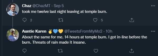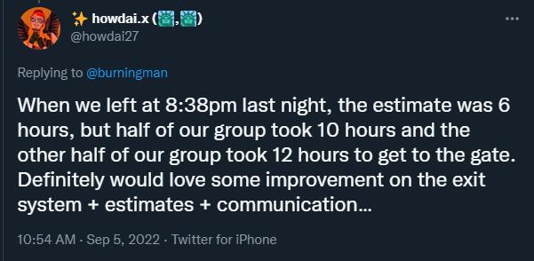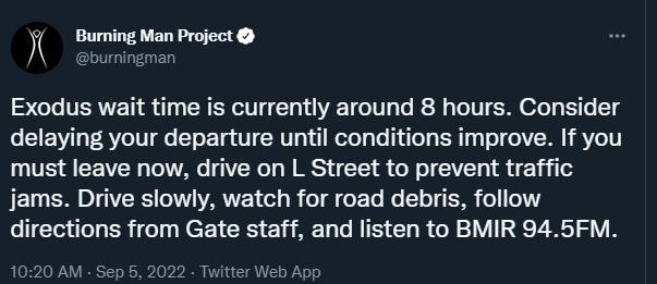 在周一9月5日,也就是结束当夜之后的第一个白天,火人节官方账号发布推文表示,退场等待时间大约长达8个小时。