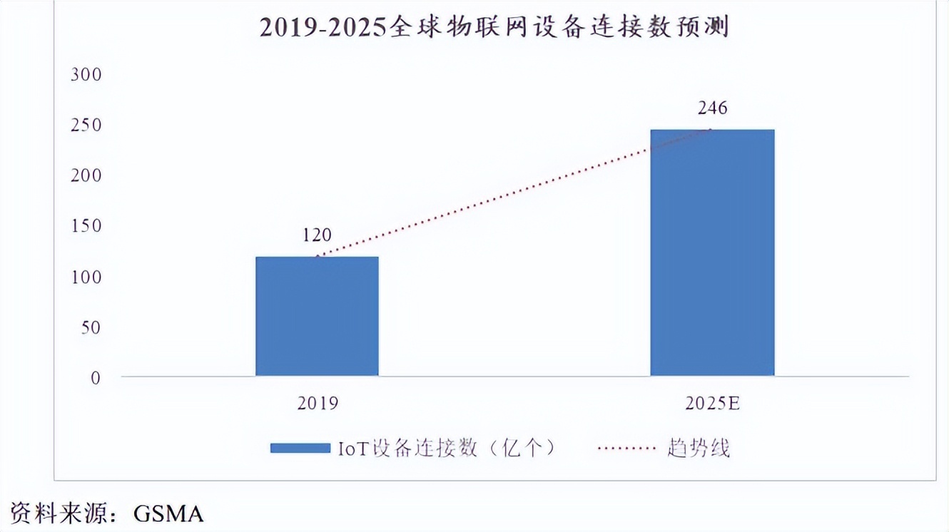 5G技术的出现,进一步加速了数字经济的发展,这其中IOT智能终端行业也迎来了新的发展机遇。根据GSMA数据显示,2019年全球IoT的收入为3430亿美元,预计到2025年将增长到1.1万亿美元,年复合增长率高达21.4%,IoT领域未来发展空间巨大。