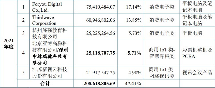 从业多年,公司在业内积累了众多知名客户。2021年,公司的前五大客户分别是Foryou Digital Co.,Ltd.、Thirdwave Corporation、杭州施强教育科技有限公司、北京亚博高腾科技有限公司/深圳中林瑞德科技有限公司、江苏新视云科技股份有限公司。