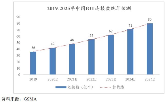 纵观全球IOT市场,我国IOT市场一枝独秀。在国家有关支持IoT发展政策的推动下,IoT技术发展加速,我国IoT设备连接数 全球占比高达30%。2019年我国IoT设备连接数已经达到36亿个的规模,到2025 年,预计我国IoT连接数将达到80亿个,年复合增长率14.1%。截至2020年,我国物联网产业规模突破 1.7万亿元,2016-2020年,IoT总体产业规模保持20%的年均增长率。