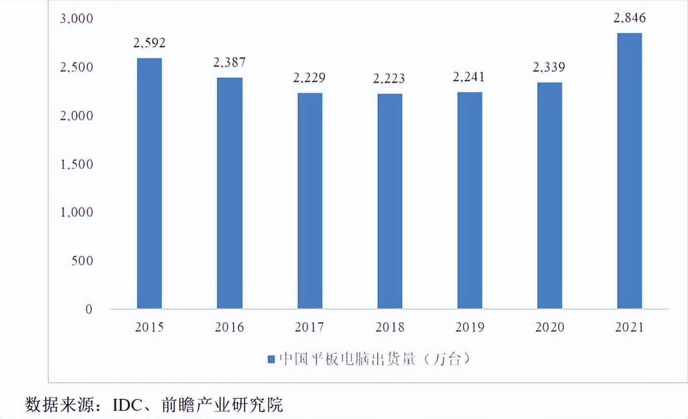根据IDC发布数据显示,2015-2018年中国的平板电脑市场一直处于下行状态, 2019年市场有所回暖,2021年中国平板电脑市场出货量约2846万台,同比增长 21.8%,创近年来出货量最高增幅。另外,受疫情影响,以及平板逐步应用于车载、零售、交通等细分领域,应用场景的不断丰富将驱动平板电脑细分领域市场规模不断扩大。
