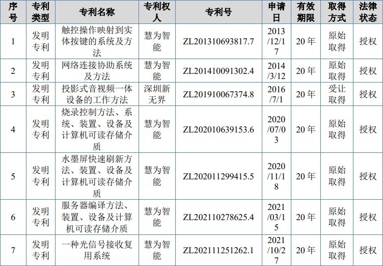 截至2022年6月,深圳市慧为智能科技股份有限公司已获得214项自主知识产权,其中发明专利14项、实用新型专利27项、外观设计专利26项、软件著作权147项。另外,公司已经通过了中国3C认证、欧盟制造商CE认证、美国联邦通信委员会FCC认证、日本无线电设备TELEC认证、日本强制性安全PSE认证、韩国电子电气用品安全KC认证等多项专业认证。