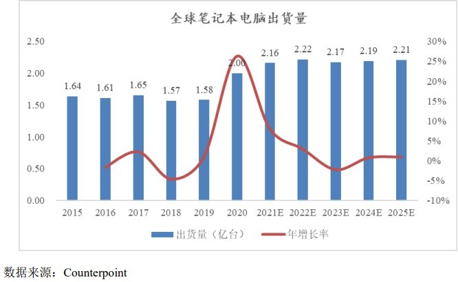根据Counterpoint数据显示,2020年全球笔记本电脑出货量为2亿台,出货量同比增长26.3%;Counterpoint预估,到2025年全球笔记本电脑将增长至2.21 亿台,2020-2025年复合增长率预计为2.02%。