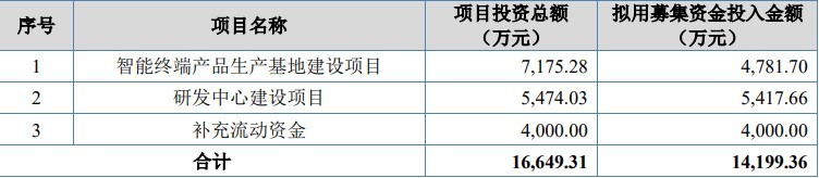 IPO募资方面,公司本次拟募资1.41亿元,资金将用于智能终端产品生产基地建设项目、以及研发中心建设项目。此次项目将形成公司在粤港澳大湾区的综合性生产场地、办公研发场地、仓储等辅助场地设施的整体布局,购置先进的自动化生产线、实验设备,不断加强公司智能终端产品的质量和产能供给稳定性。