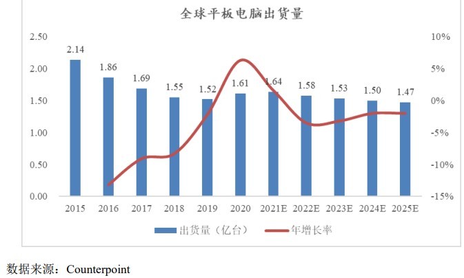 平板市场方面,根据Counterpoint数据,2020年全球平板电脑的出货量实现 6.3%的正增长,出货量为1.61亿台,预计未来五年的平均出货量为1.5 亿台。