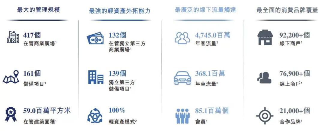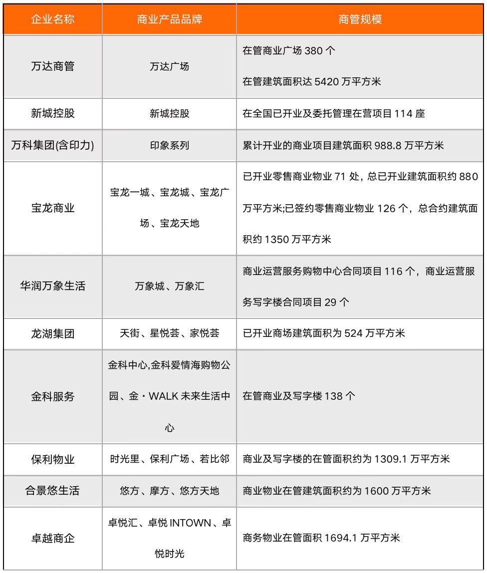从体量上来说万达仍然是国内商管巨头。根据弗若斯特沙利文的数据显示,截至2020年年末,万达商管在管建筑面积排在中国乃至世界第一的位置,超过中国第二名至第十名的总和;储备建筑面积以及管理第三方商业广场数量皆位于首位。