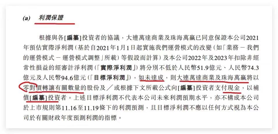 当然压力最大的还是盈利要求。招股书显示万达商管主要股东正背负着三年的对赌协议,协议要求万达商管在2021年至2023年三年间净利润分别达到51.9亿元、74.3亿元和94.6亿元,如未达成,则大连万达商业及珠海万赢将以零对价转让有关数量的股份或向投资者支付现金以作为补偿。目前来看万达这份业绩对赌完成的并不好。