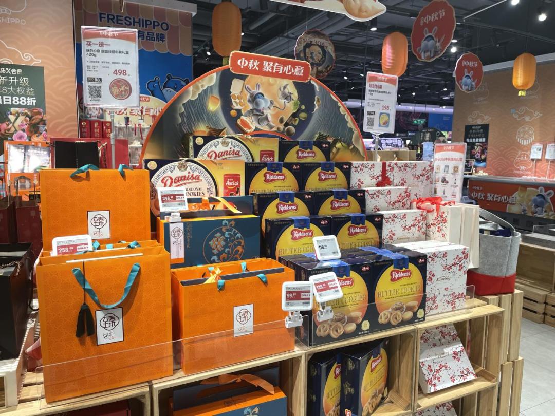 月饼礼盒方面,店内以美心月饼和故宫食品等品牌为主,并且附上了例如低糖、低GI(低升糖指数)等诸多特性。据盒马工作人员介绍,店内销量第一的是一款标价199元的美心低糖蛋黄白莲蓉月饼。