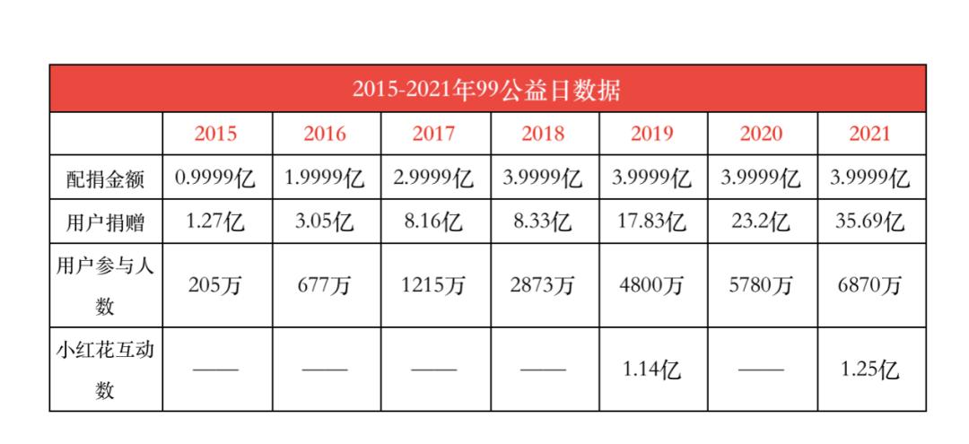 2015年,为了培养国民慈善意识,腾讯联合各方发起了一次大胆的公益尝试:在9月7日-9日期间,腾讯拿出9999万真金白银,对公益平台上的项目进行1:1配捐:用户捐多少,腾讯配捐多少。用户反应非常热烈,配捐在短短几小时消耗殆尽,用户捐款高达1.27亿。这也是99公益日的由来。