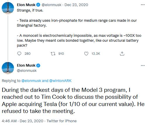 到了2020年,苹果被爆出有突破性的电池技术进展,整个汽车项目有可能提速。这个时候,马斯克发动“不给面子”技能,讲述了一个悲伤的故事。