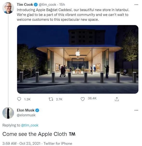 2021年10月,库克发推庆祝伊斯坦布尔新店落地,马斯克在评论区回复:“快来瞧瞧苹果抛光布。”调侃苹果上架官网的一款“高价抛光布”,售价145元。