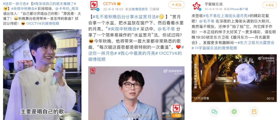 央视秋晚则是未播先火,先是凭卷死卫视的明星壕阵,预热阶段就贡献了 #李宇春秋晚节目将和宇航员互动#、#周深大鱼版但愿人长久#等明星向的话题热点。